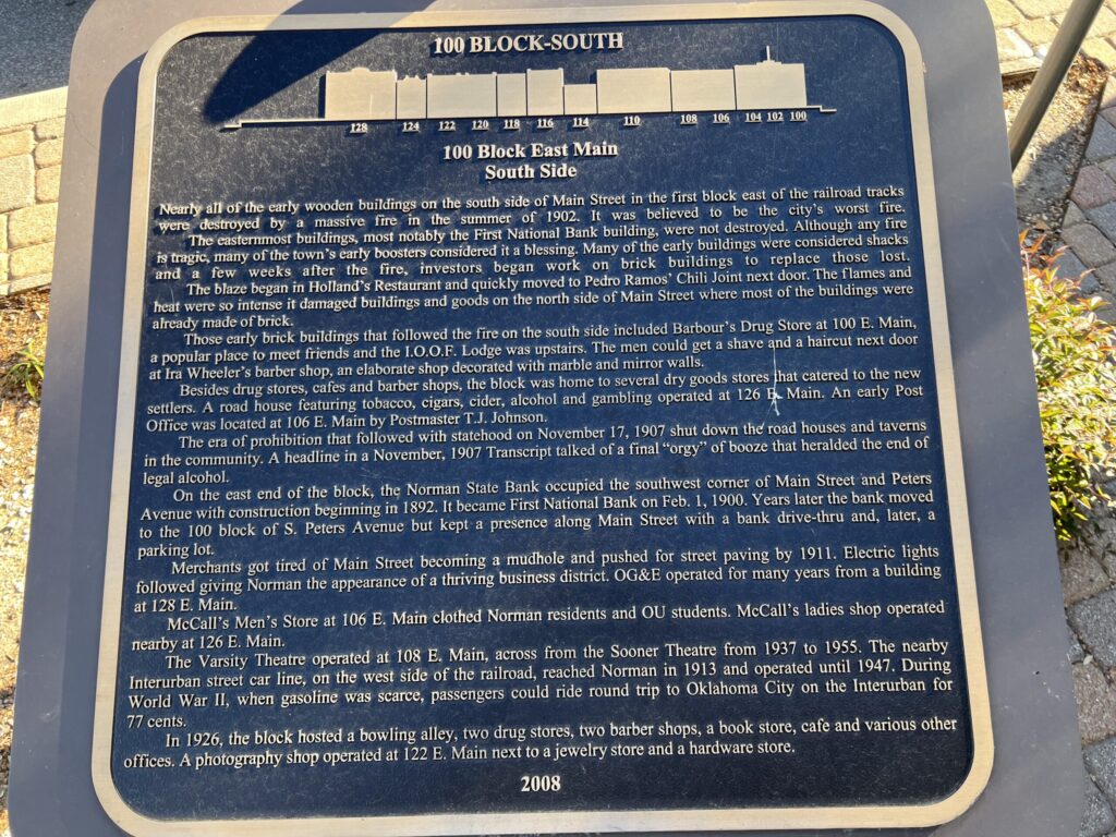 The worst structural fire to hit Norman occurred on July 7, 1902. It wiped out wooden buildings on the south side of Main Street that were immediately east of the railroad tracks. The Norman community responded by replacing the wooden shacks with brick buildings, which had already been erected on the north side of Main Street. (Despite the stronger structures on the north side of the street, those buildings also sustained considerable damage from the heat of the fire.)